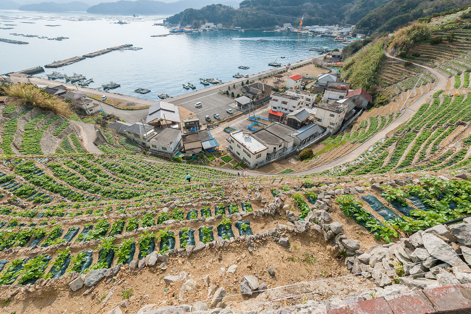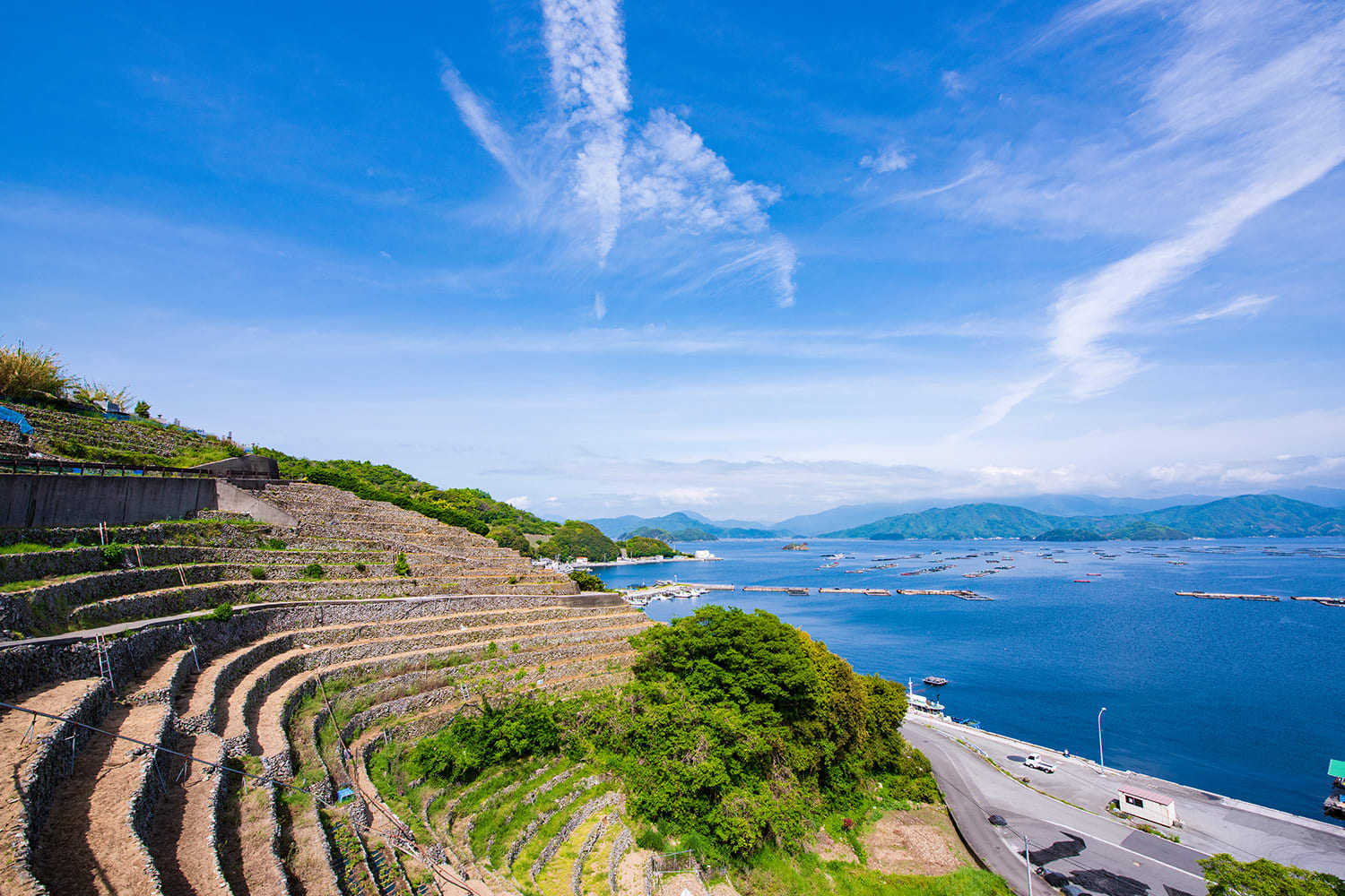利用宇和海半岛突出的石墙修成的梯田,眼前是宇和海美景,堪称一绝。建于斜面上的梯田,据说阳光照射好,石墙的温热效果有助于农作物生长,是凝结了人类智慧的景观美。不仅入选了“日本农村百景”,平成19年(2007年)还被选定为“日本国家重要文化景观”。顶部海拔高80米,超过30度角的倾斜地形,从下往上看,会看到仿佛登天一般的台阶。